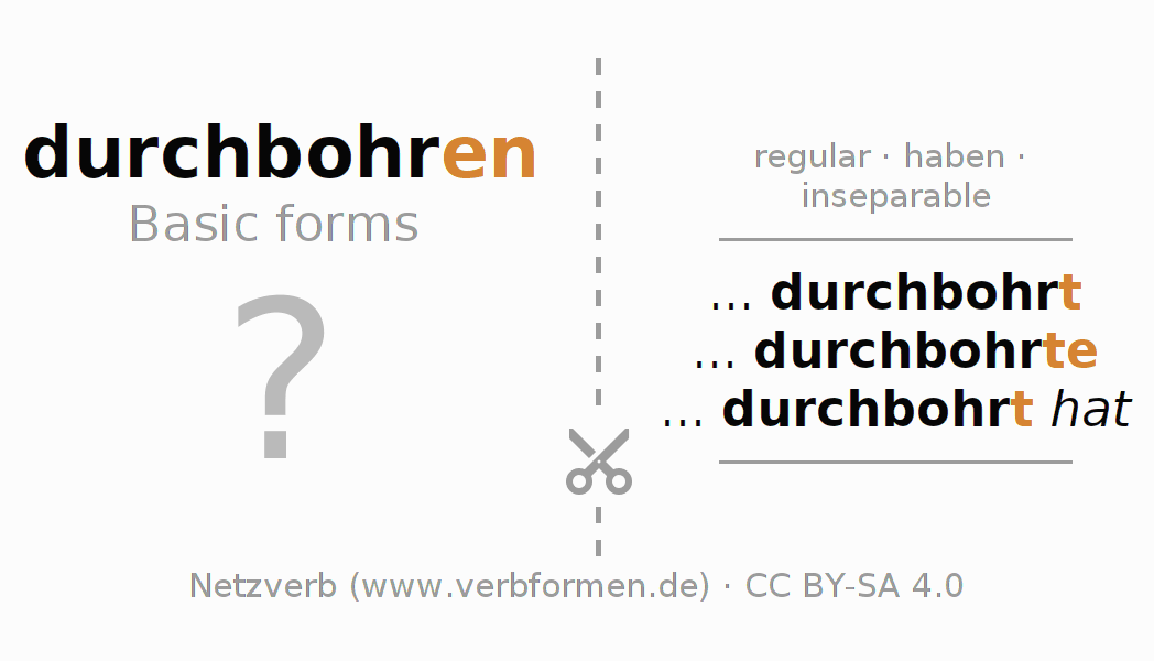 Worksheets are used generally for the conjugation of the verb durchbohren in teaching. The materials can be used as Open Educational Resources (OER) for exercises, for games and as Tasks (CC BY-SA 4.0). There are many different types of tasks available for the verb durchbohren. These are overview sheets with complete conjugation, puzzles and games that require joint learning. The entire educational material is available for free as a PDF download, as pictures and as an interactive browser version. In addition to the tasks, countless examples for durchbohren also provide an aid to using the verb.