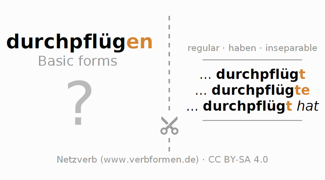 Worksheets are used generally for the conjugation of the verb durchpflügen in teaching. The materials can be used as Open Educational Resources (OER) for exercises, for games and as Tasks (CC BY-SA 4.0). There are many different types of tasks available for the verb durchpflügen. These are overview sheets with complete conjugation, puzzles and games that require joint learning. The entire educational material is available for free as a PDF download, as pictures and as an interactive browser version. In addition to the tasks, countless examples for durchpflügen also provide an aid to using the verb.