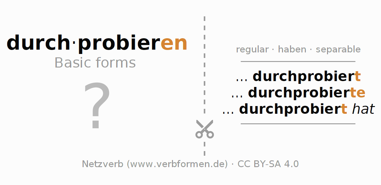 Worksheets are used generally for the conjugation of the verb durchprobieren in teaching. The materials can be used as Open Educational Resources (OER) for exercises, for games and as Tasks (CC BY-SA 4.0). There are many different types of tasks available for the verb durchprobieren. These are overview sheets with complete conjugation, puzzles and games that require joint learning. The entire educational material is available for free as a PDF download, as pictures and as an interactive browser version. In addition to the tasks, countless examples for durchprobieren also provide an aid to using the verb.