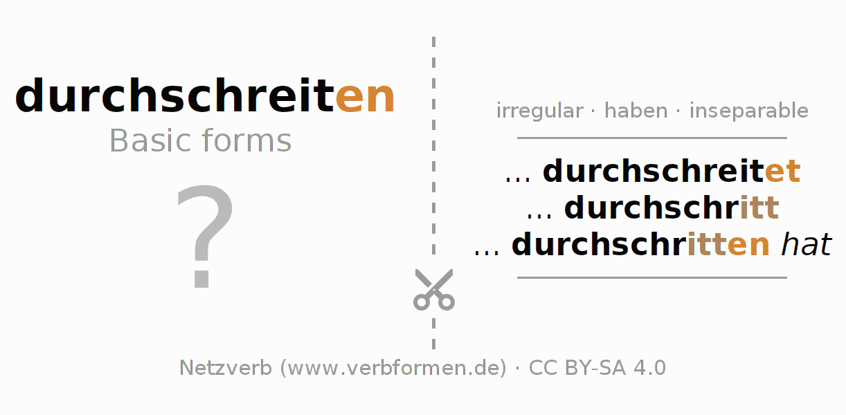 Worksheets are used generally for the conjugation of the verb durchschreiten in teaching. The materials can be used as Open Educational Resources (OER) for exercises, for games and as Tasks (CC BY-SA 4.0). There are many different types of tasks available for the verb durchschreiten. These are overview sheets with complete conjugation, puzzles and games that require joint learning. The entire educational material is available for free as a PDF download, as pictures and as an interactive browser version. In addition to the tasks, countless examples for durchschreiten also provide an aid to using the verb.