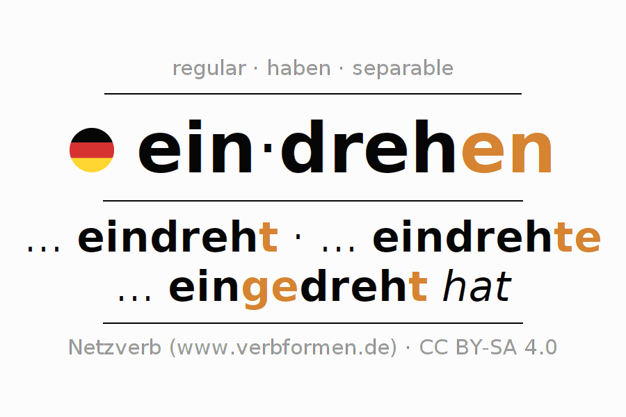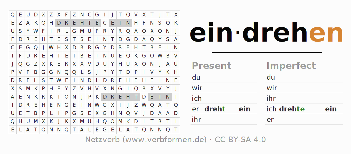 Worksheets are used generally for the conjugation of the verb eindrehen in teaching. The materials can be used as Open Educational Resources (OER) for exercises, for games and as Tasks (CC BY-SA 4.0). There are many different types of tasks available for the verb eindrehen. These are overview sheets with complete conjugation, puzzles and games that require joint learning. The entire educational material is available for free as a PDF download, as pictures and as an interactive browser version. In addition to the tasks, countless examples for eindrehen also provide an aid to using the verb.