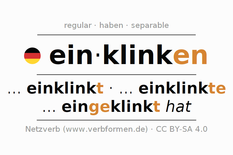 Worksheets are used generally for the conjugation of the verb einklinken in teaching. The materials can be used as Open Educational Resources (OER) for exercises, for games and as Tasks (CC BY-SA 4.0). There are many different types of tasks available for the verb einklinken (hat). These are overview sheets with complete conjugation, puzzles and games that require joint learning. The entire educational material is available for free as a PDF download, as pictures and as an interactive browser version. In addition to the tasks, countless examples for einklinken also provide an aid to using the verb.