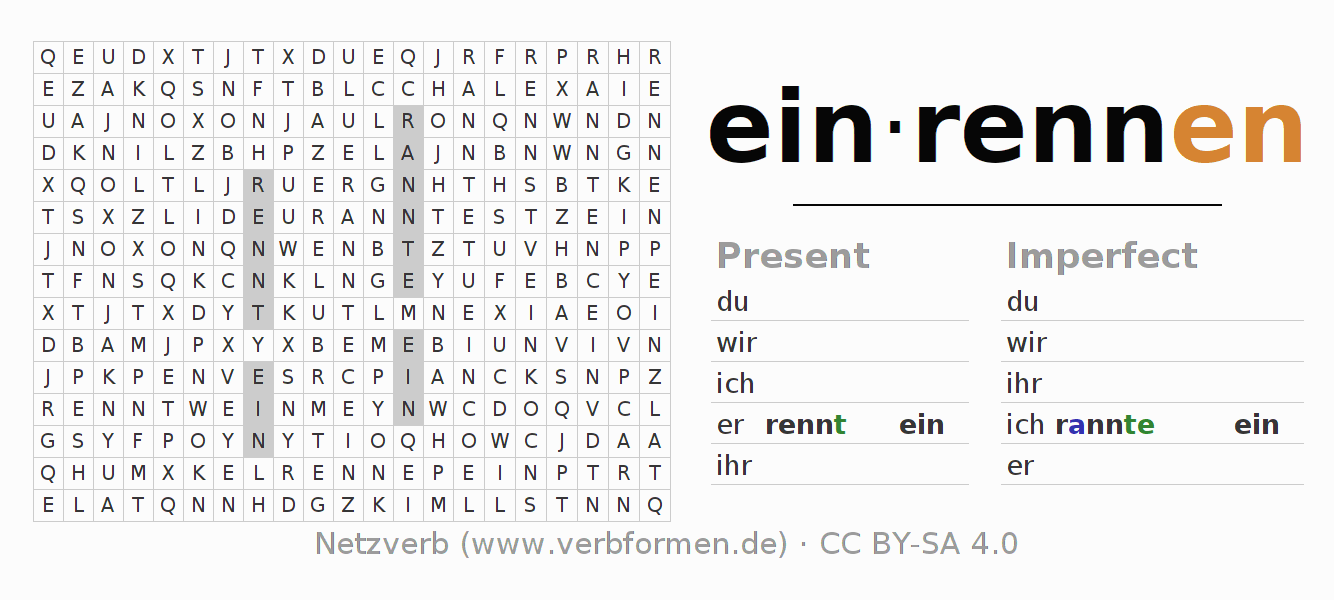 With these search word puzzles you can learn the conjugation of the German verb einrennen.