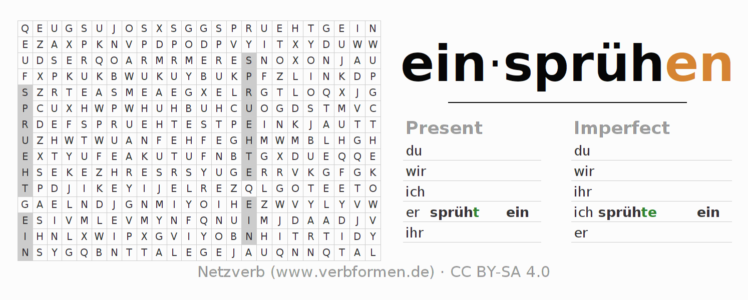 Worksheets are used generally for the conjugation of the verb einsprühen in teaching. The materials can be used as Open Educational Resources (OER) for exercises, for games and as Tasks (CC BY-SA 4.0). There are many different types of tasks available for the verb einsprühen. These are overview sheets with complete conjugation, puzzles and games that require joint learning. The entire educational material is available for free as a PDF download, as pictures and as an interactive browser version. In addition to the tasks, countless examples for einsprühen also provide an aid to using the verb.
