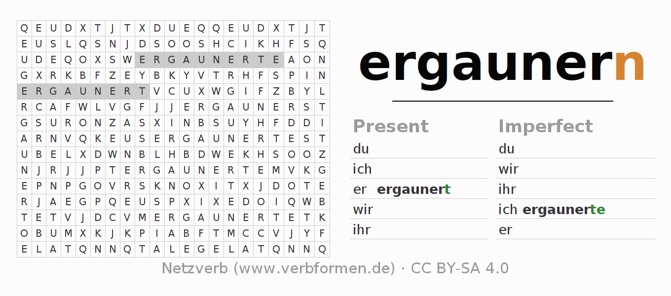 With these search word puzzles you can learn the conjugation of the German verb ergaunern.
