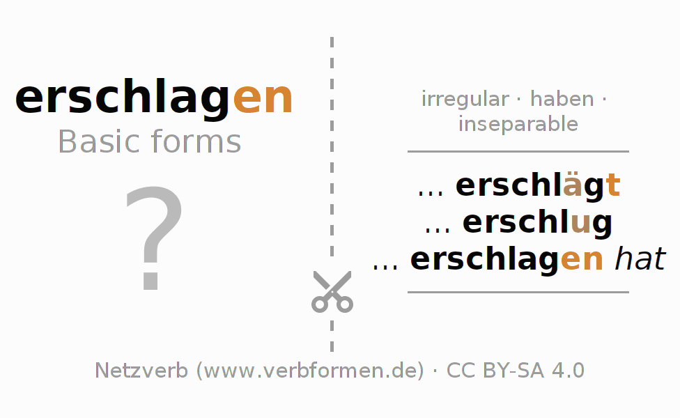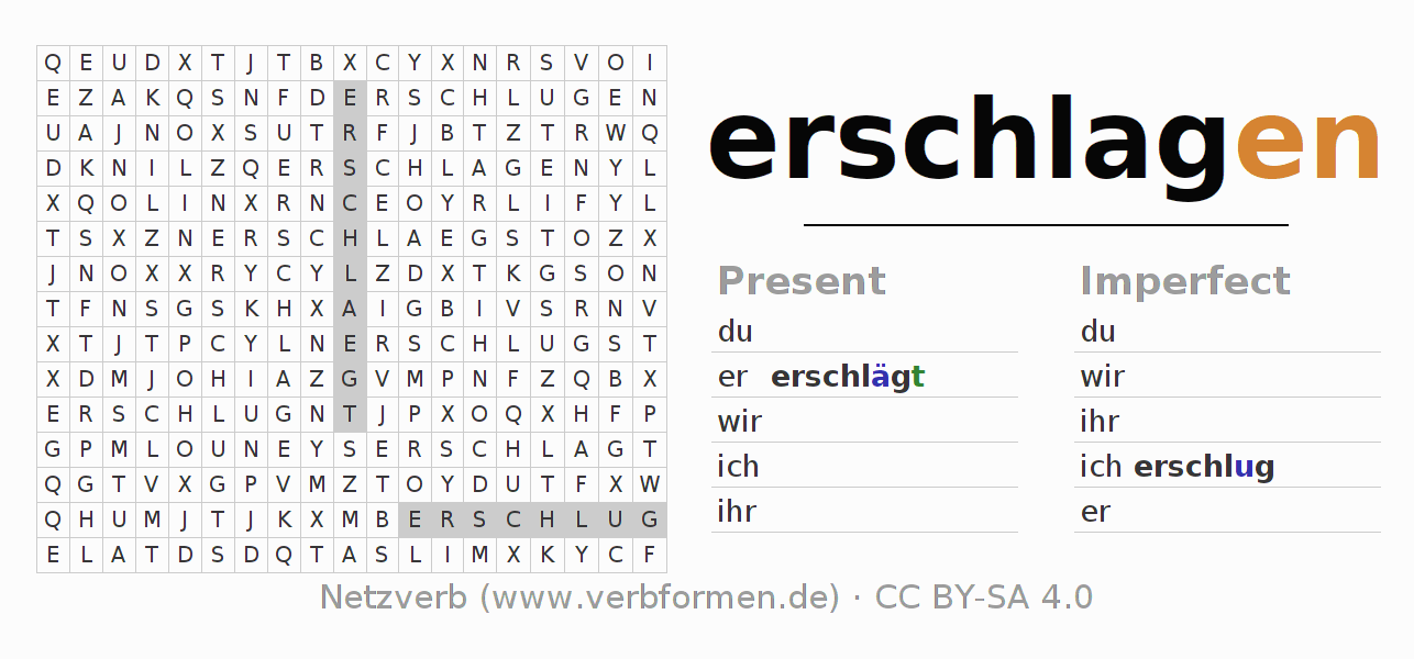 Worksheets are used generally for the conjugation of the verb erschlagen in teaching. The materials can be used as Open Educational Resources (OER) for exercises, for games and as Tasks (CC BY-SA 4.0). There are many different types of tasks available for the verb erschlagen. These are overview sheets with complete conjugation, puzzles and games that require joint learning. The entire educational material is available for free as a PDF download, as pictures and as an interactive browser version. In addition to the tasks, countless examples for erschlagen also provide an aid to using the verb.