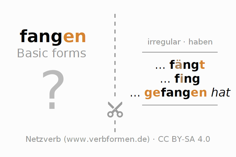 Worksheets are used generally for the conjugation of the verb fangen in teaching. The materials can be used as Open Educational Resources (OER) for exercises, for games and as Tasks (CC BY-SA 4.0). There are many different types of tasks available for the verb fangen. These are overview sheets with complete conjugation, puzzles and games that require joint learning. The entire educational material is available for free as a PDF download, as pictures and as an interactive browser version. In addition to the tasks, countless examples for fangen also provide an aid to using the verb.