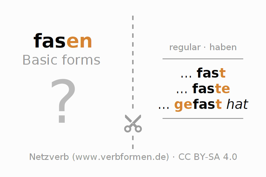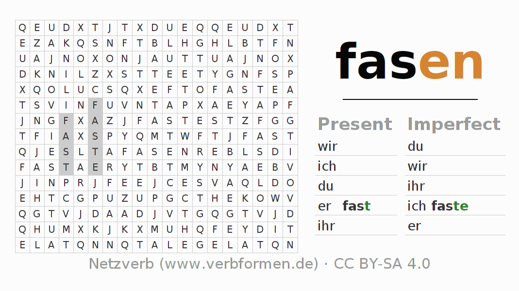Worksheets are used generally for the conjugation of the verb fasen in teaching. The materials can be used as Open Educational Resources (OER) for exercises, for games and as Tasks (CC BY-SA 4.0). There are many different types of tasks available for the verb fasen. These are overview sheets with complete conjugation, puzzles and games that require joint learning. The entire educational material is available for free as a PDF download, as pictures and as an interactive browser version. In addition to the tasks, countless examples for fasen also provide an aid to using the verb.