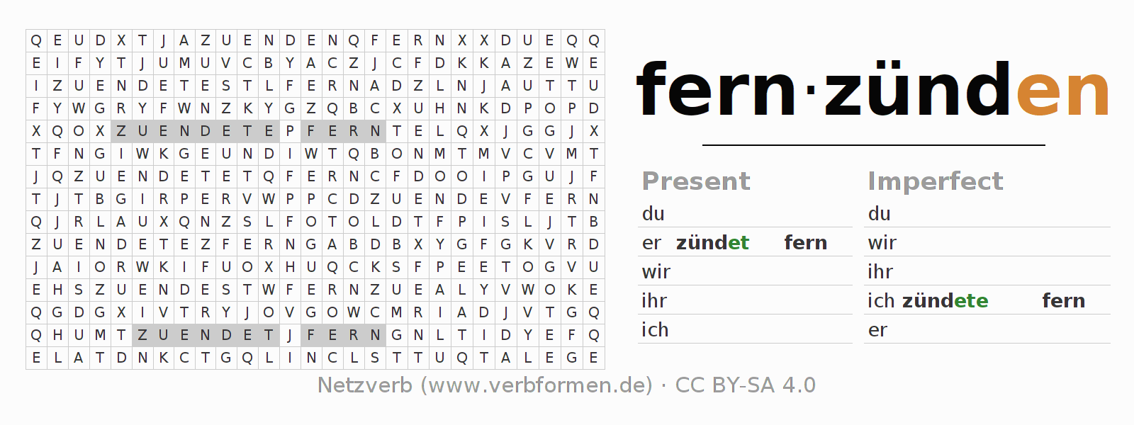 With these search word puzzles you can learn the conjugation of the German verb fernzünden.