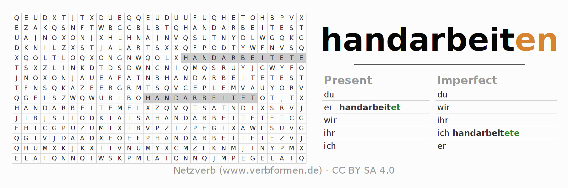 With these search word puzzles you can learn the conjugation of the German verb handarbeiten.