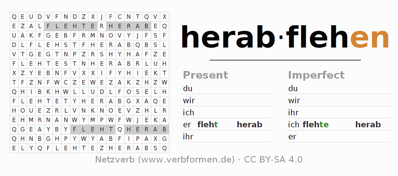 With these search word puzzles you can learn the conjugation of the German verb herabflehen.
