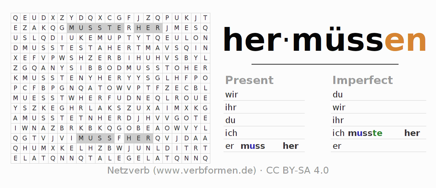 With these search word puzzles you can learn the conjugation of the German verb hermüssen.