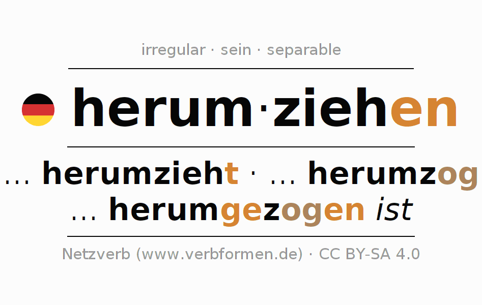 Worksheets are used generally for the conjugation of the verb herumziehen in teaching. The materials can be used as Open Educational Resources (OER) for exercises, for games and as Tasks (CC BY-SA 4.0). There are many different types of tasks available for the verb herumziehen (ist). These are overview sheets with complete conjugation, puzzles and games that require joint learning. The entire educational material is available for free as a PDF download, as pictures and as an interactive browser version. In addition to the tasks, countless examples for herumziehen also provide an aid to using the verb.