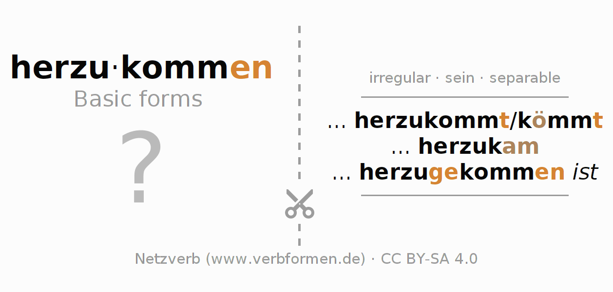 Worksheets are used generally for the conjugation of the verb herzukommen in teaching. The materials can be used as Open Educational Resources (OER) for exercises, for games and as Tasks (CC BY-SA 4.0). There are many different types of tasks available for the verb herzukommen. These are overview sheets with complete conjugation, puzzles and games that require joint learning. The entire educational material is available for free as a PDF download, as pictures and as an interactive browser version. In addition to the tasks, countless examples for herzukommen also provide an aid to using the verb.