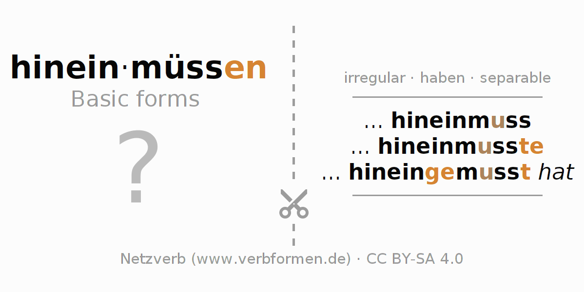 Worksheets are used generally for the conjugation of the verb hineinmüssen in teaching. The materials can be used as Open Educational Resources (OER) for exercises, for games and as Tasks (CC BY-SA 4.0). There are many different types of tasks available for the verb hineinmüssen. These are overview sheets with complete conjugation, puzzles and games that require joint learning. The entire educational material is available for free as a PDF download, as pictures and as an interactive browser version. In addition to the tasks, countless examples for hineinmüssen also provide an aid to using the verb.