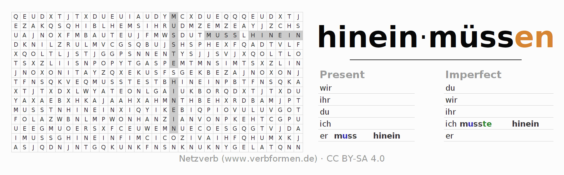 With these search word puzzles you can learn the conjugation of the German verb hineinmüssen.