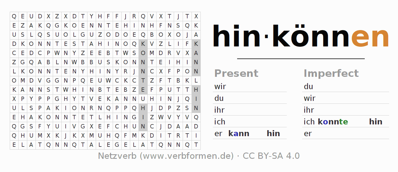 With these search word puzzles you can learn the conjugation of the German verb hinkönnen.