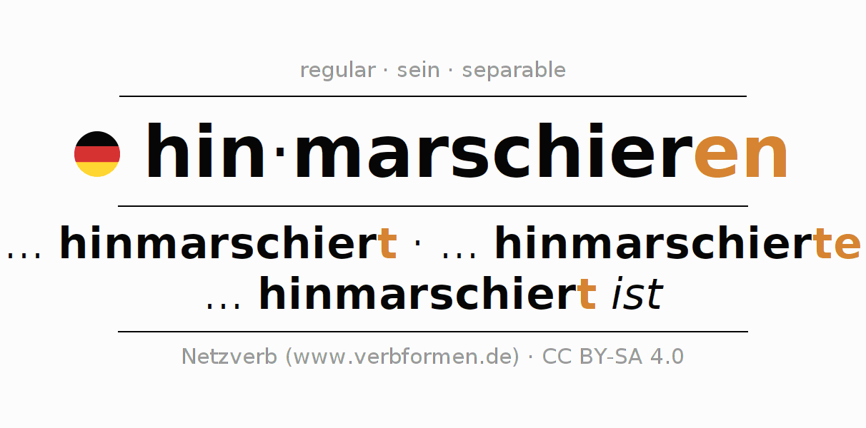 Worksheets are used generally for the conjugation of the verb hinmarschieren in teaching. The materials can be used as Open Educational Resources (OER) for exercises, for games and as Tasks (CC BY-SA 4.0). There are many different types of tasks available for the verb hinmarschieren. These are overview sheets with complete conjugation, puzzles and games that require joint learning. The entire educational material is available for free as a PDF download, as pictures and as an interactive browser version. In addition to the tasks, countless examples for hinmarschieren also provide an aid to using the verb.