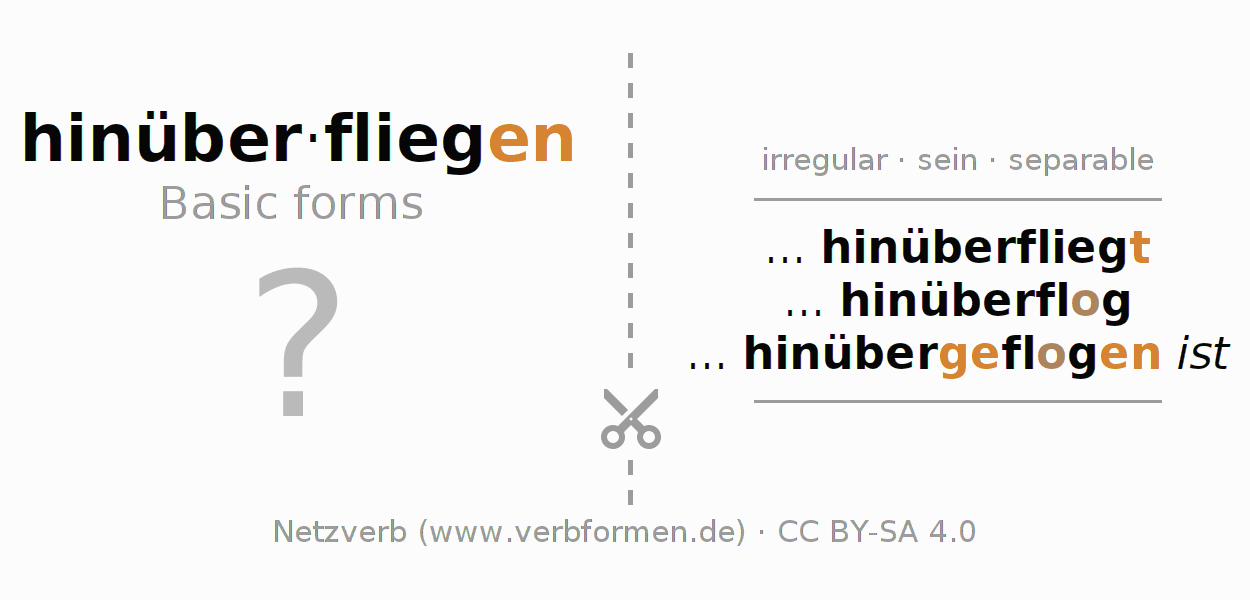 Worksheets are used generally for the conjugation of the verb hinüberfliegen in teaching. The materials can be used as Open Educational Resources (OER) for exercises, for games and as Tasks (CC BY-SA 4.0). There are many different types of tasks available for the verb hinüberfliegen (ist). These are overview sheets with complete conjugation, puzzles and games that require joint learning. The entire educational material is available for free as a PDF download, as pictures and as an interactive browser version. In addition to the tasks, countless examples for hinüberfliegen also provide an aid to using the verb.