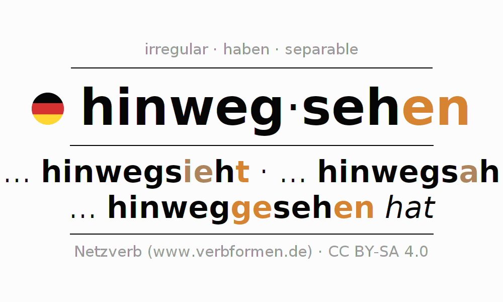 Worksheets are used generally for the conjugation of the verb hinwegsehen in teaching. The materials can be used as Open Educational Resources (OER) for exercises, for games and as Tasks (CC BY-SA 4.0). There are many different types of tasks available for the verb hinwegsehen. These are overview sheets with complete conjugation, puzzles and games that require joint learning. The entire educational material is available for free as a PDF download, as pictures and as an interactive browser version. In addition to the tasks, countless examples for hinwegsehen also provide an aid to using the verb.