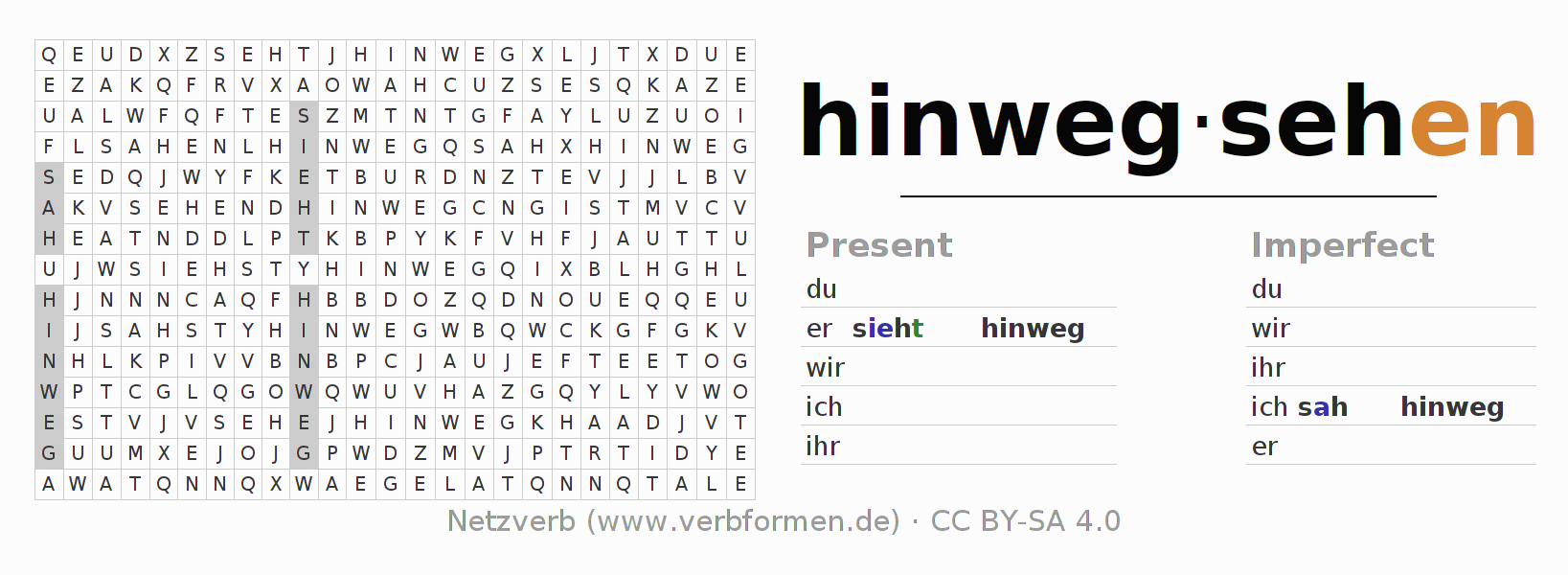With these search word puzzles you can learn the conjugation of the German verb hinwegsehen.