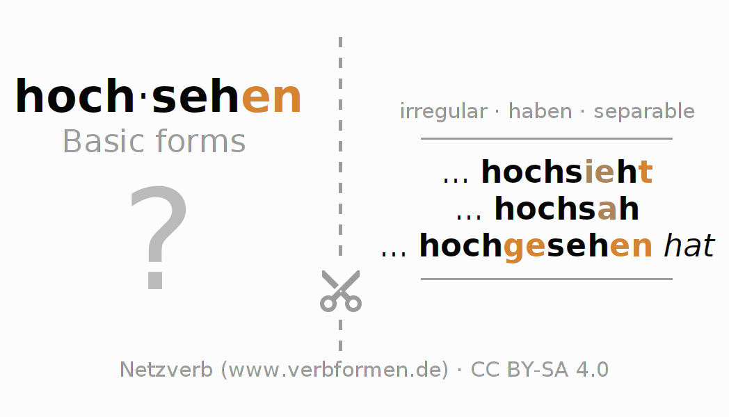 Worksheets are used generally for the conjugation of the verb hochsehen in teaching. The materials can be used as Open Educational Resources (OER) for exercises, for games and as Tasks (CC BY-SA 4.0). There are many different types of tasks available for the verb hochsehen. These are overview sheets with complete conjugation, puzzles and games that require joint learning. The entire educational material is available for free as a PDF download, as pictures and as an interactive browser version. In addition to the tasks, countless examples for hochsehen also provide an aid to using the verb.