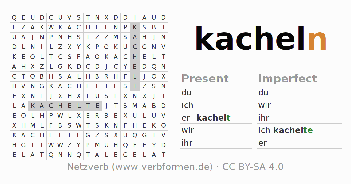 With these search word puzzles you can learn the conjugation of the German verb kacheln.