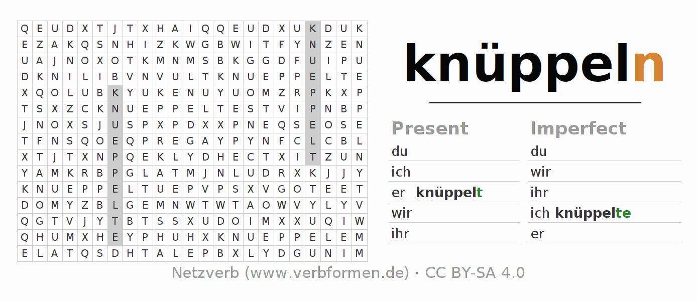 With these search word puzzles you can learn the conjugation of the German verb knüppeln.