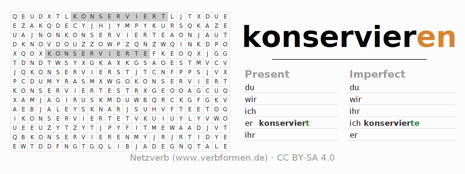 With these search word puzzles you can learn the conjugation of the German verb konservieren.