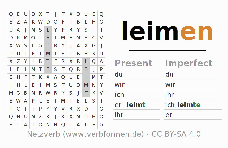 Worksheets are used generally for the conjugation of the verb leimen in teaching. The materials can be used as Open Educational Resources (OER) for exercises, for games and as Tasks (CC BY-SA 4.0). There are many different types of tasks available for the verb leimen. These are overview sheets with complete conjugation, puzzles and games that require joint learning. The entire educational material is available for free as a PDF download, as pictures and as an interactive browser version. In addition to the tasks, countless examples for leimen also provide an aid to using the verb.