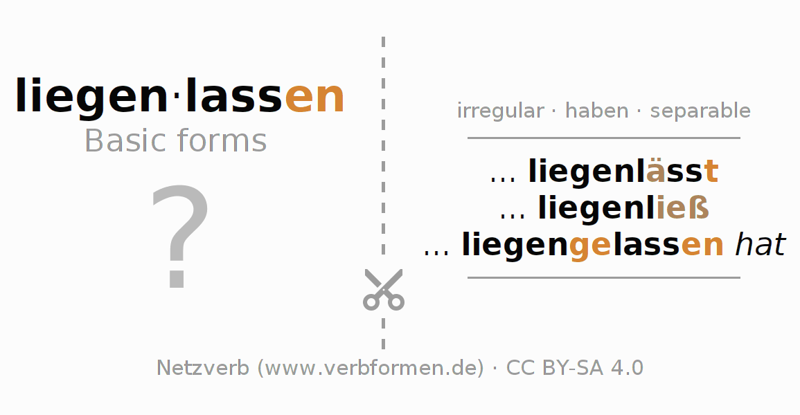 Worksheets are used generally for the conjugation of the verb liegenlassen in teaching. The materials can be used as Open Educational Resources (OER) for exercises, for games and as Tasks (CC BY-SA 4.0). There are many different types of tasks available for the verb liegenlassen. These are overview sheets with complete conjugation, puzzles and games that require joint learning. The entire educational material is available for free as a PDF download, as pictures and as an interactive browser version. In addition to the tasks, countless examples for liegenlassen also provide an aid to using the verb.