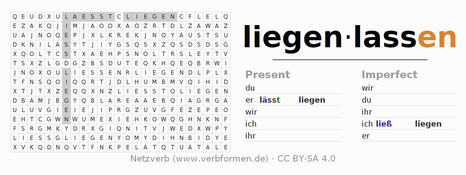 With these search word puzzles you can learn the conjugation of the German verb liegenlassen.