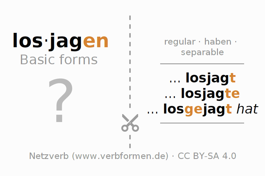 Worksheets are used generally for the conjugation of the verb losjagen in teaching. The materials can be used as Open Educational Resources (OER) for exercises, for games and as Tasks (CC BY-SA 4.0). There are many different types of tasks available for the verb losjagen (hat). These are overview sheets with complete conjugation, puzzles and games that require joint learning. The entire educational material is available for free as a PDF download, as pictures and as an interactive browser version. In addition to the tasks, countless examples for losjagen also provide an aid to using the verb.