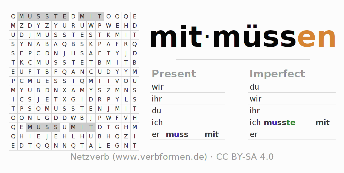 With these search word puzzles you can learn the conjugation of the German verb mitmüssen.