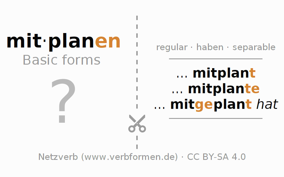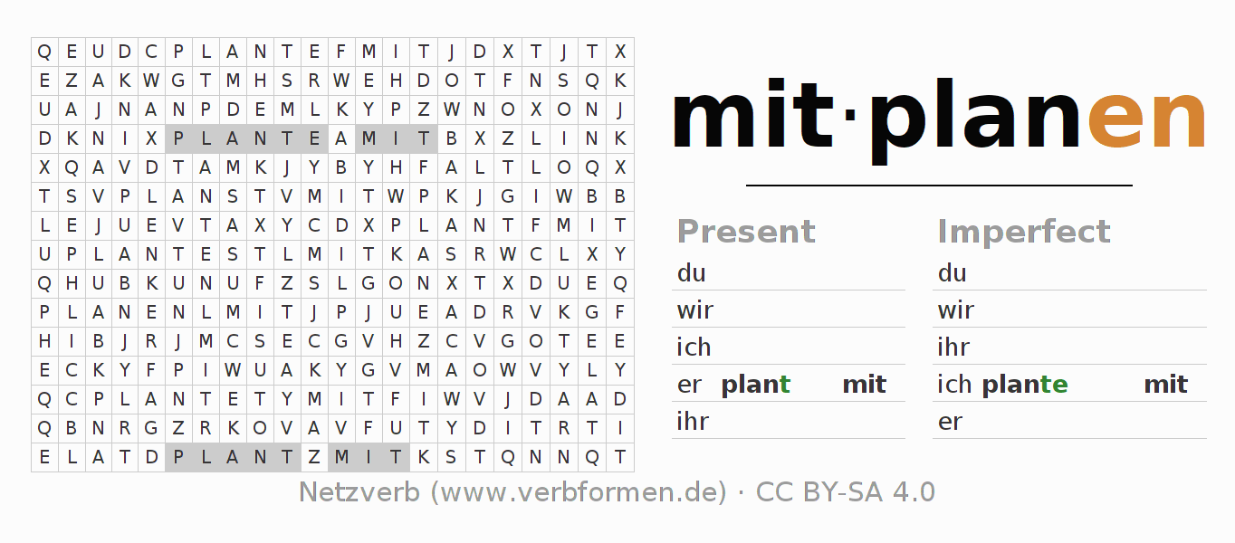 Worksheets are used generally for the conjugation of the verb mitplanen in teaching. The materials can be used as Open Educational Resources (OER) for exercises, for games and as Tasks (CC BY-SA 4.0). There are many different types of tasks available for the verb mitplanen. These are overview sheets with complete conjugation, puzzles and games that require joint learning. The entire educational material is available for free as a PDF download, as pictures and as an interactive browser version. In addition to the tasks, countless examples for mitplanen also provide an aid to using the verb.