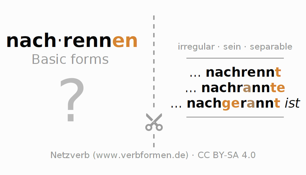 Worksheets are used generally for the conjugation of the verb nachrennen in teaching. The materials can be used as Open Educational Resources (OER) for exercises, for games and as Tasks (CC BY-SA 4.0). There are many different types of tasks available for the verb nachrennen. These are overview sheets with complete conjugation, puzzles and games that require joint learning. The entire educational material is available for free as a PDF download, as pictures and as an interactive browser version. In addition to the tasks, countless examples for nachrennen also provide an aid to using the verb.