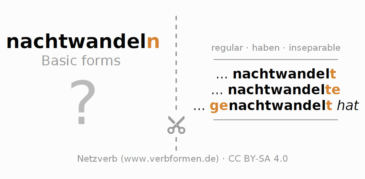 Worksheets are used generally for the conjugation of the verb nachtwandeln in teaching. The materials can be used as Open Educational Resources (OER) for exercises, for games and as Tasks (CC BY-SA 4.0). There are many different types of tasks available for the verb nachtwandeln (hat). These are overview sheets with complete conjugation, puzzles and games that require joint learning. The entire educational material is available for free as a PDF download, as pictures and as an interactive browser version. In addition to the tasks, countless examples for nachtwandeln also provide an aid to using the verb.