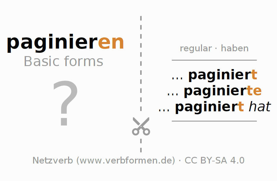Worksheets are used generally for the conjugation of the verb paginieren in teaching. The materials can be used as Open Educational Resources (OER) for exercises, for games and as Tasks (CC BY-SA 4.0). There are many different types of tasks available for the verb paginieren. These are overview sheets with complete conjugation, puzzles and games that require joint learning. The entire educational material is available for free as a PDF download, as pictures and as an interactive browser version. In addition to the tasks, countless examples for paginieren also provide an aid to using the verb.