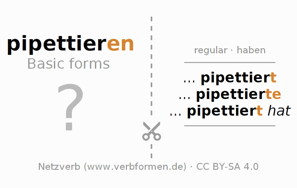 Worksheets are used generally for the conjugation of the verb pipettieren in teaching. The materials can be used as Open Educational Resources (OER) for exercises, for games and as Tasks (CC BY-SA 4.0). There are many different types of tasks available for the verb pipettieren. These are overview sheets with complete conjugation, puzzles and games that require joint learning. The entire educational material is available for free as a PDF download, as pictures and as an interactive browser version. In addition to the tasks, countless examples for pipettieren also provide an aid to using the verb.