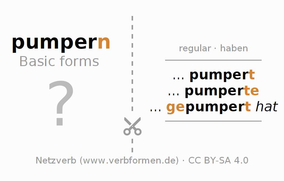 Worksheets are used generally for the conjugation of the verb pumpern in teaching. The materials can be used as Open Educational Resources (OER) for exercises, for games and as Tasks (CC BY-SA 4.0). There are many different types of tasks available for the verb pumpern. These are overview sheets with complete conjugation, puzzles and games that require joint learning. The entire educational material is available for free as a PDF download, as pictures and as an interactive browser version. In addition to the tasks, countless examples for pumpern also provide an aid to using the verb.