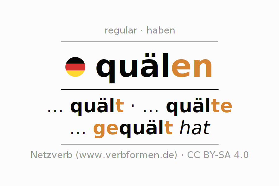 Worksheets are used generally for the conjugation of the verb quälen in teaching. The materials can be used as Open Educational Resources (OER) for exercises, for games and as Tasks (CC BY-SA 4.0). There are many different types of tasks available for the verb quälen. These are overview sheets with complete conjugation, puzzles and games that require joint learning. The entire educational material is available for free as a PDF download, as pictures and as an interactive browser version. In addition to the tasks, countless examples for quälen also provide an aid to using the verb.