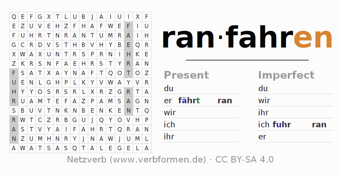 With these search word puzzles you can learn the conjugation of the German verb ranfahren.