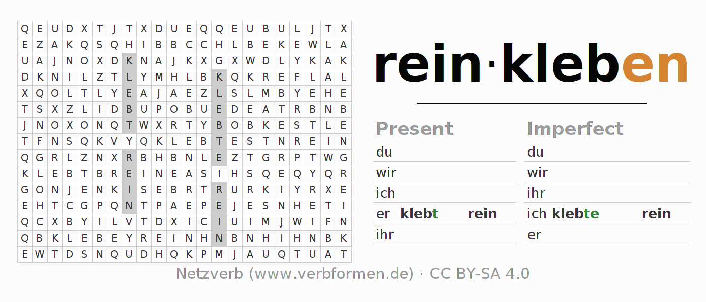 With these search word puzzles you can learn the conjugation of the German verb reinkleben.
