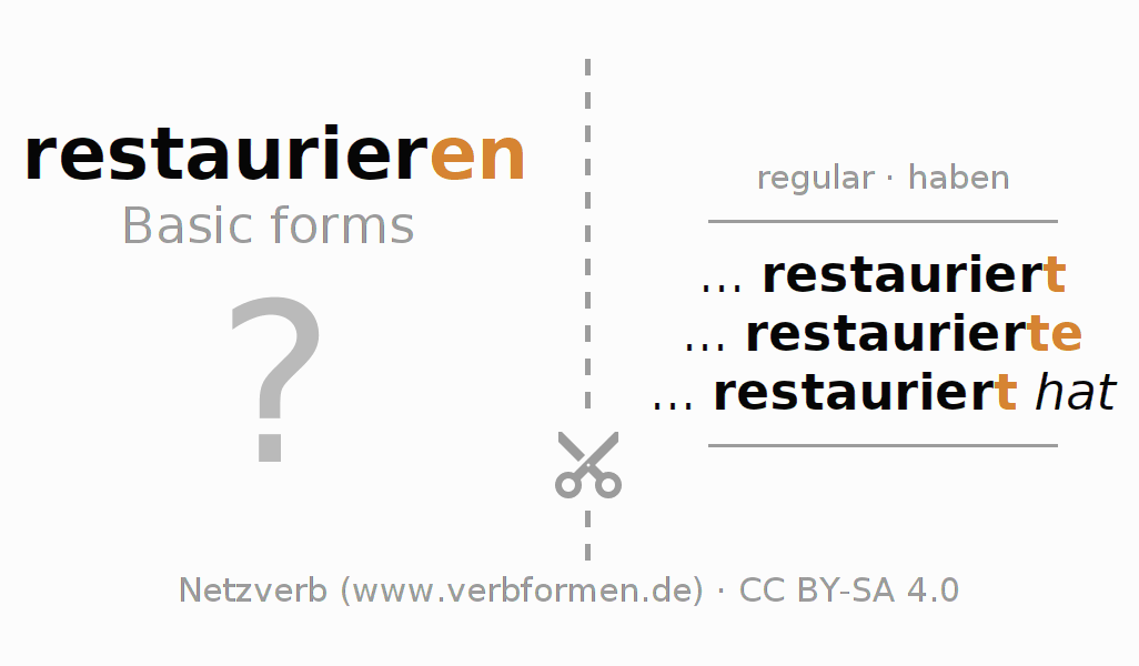 Worksheets are used generally for the conjugation of the verb restaurieren in teaching. The materials can be used as Open Educational Resources (OER) for exercises, for games and as Tasks (CC BY-SA 4.0). There are many different types of tasks available for the verb restaurieren. These are overview sheets with complete conjugation, puzzles and games that require joint learning. The entire educational material is available for free as a PDF download, as pictures and as an interactive browser version. In addition to the tasks, countless examples for restaurieren also provide an aid to using the verb.