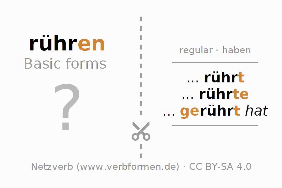 Worksheets are used generally for the conjugation of the verb rühren in teaching. The materials can be used as Open Educational Resources (OER) for exercises, for games and as Tasks (CC BY-SA 4.0). There are many different types of tasks available for the verb rühren. These are overview sheets with complete conjugation, puzzles and games that require joint learning. The entire educational material is available for free as a PDF download, as pictures and as an interactive browser version. In addition to the tasks, countless examples for rühren also provide an aid to using the verb.