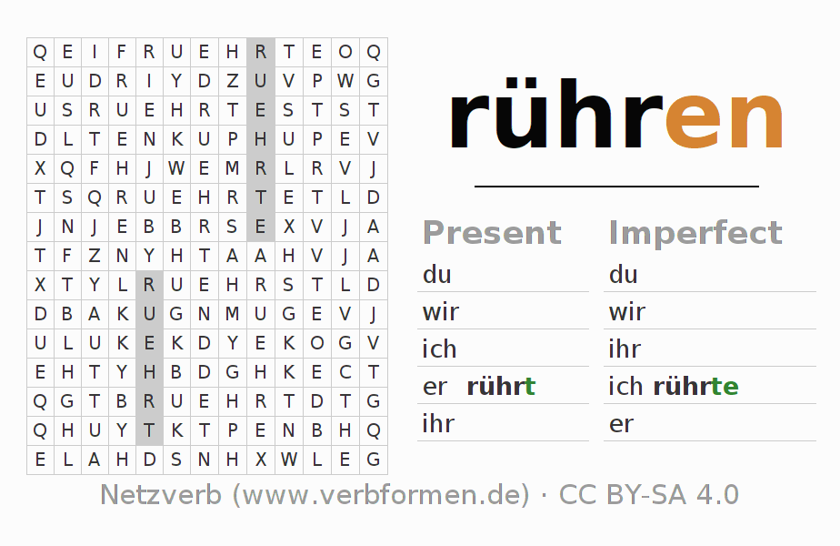 With these search word puzzles you can learn the conjugation of the German verb rühren.