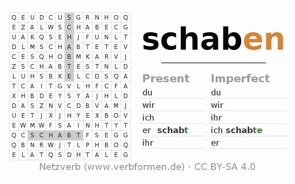 Worksheets are used generally for the conjugation of the verb schaben in teaching. The materials can be used as Open Educational Resources (OER) for exercises, for games and as Tasks (CC BY-SA 4.0). There are many different types of tasks available for the verb schaben. These are overview sheets with complete conjugation, puzzles and games that require joint learning. The entire educational material is available for free as a PDF download, as pictures and as an interactive browser version. In addition to the tasks, countless examples for schaben also provide an aid to using the verb.