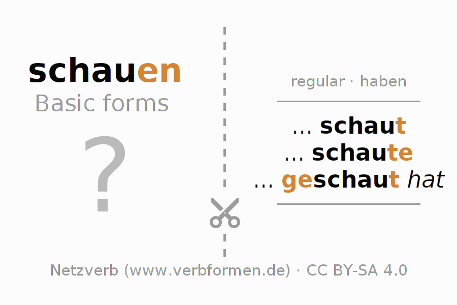 Worksheets are used generally for the conjugation of the verb schauen in teaching. The materials can be used as Open Educational Resources (OER) for exercises, for games and as Tasks (CC BY-SA 4.0). There are many different types of tasks available for the verb schauen. These are overview sheets with complete conjugation, puzzles and games that require joint learning. The entire educational material is available for free as a PDF download, as pictures and as an interactive browser version. In addition to the tasks, countless examples for schauen also provide an aid to using the verb.