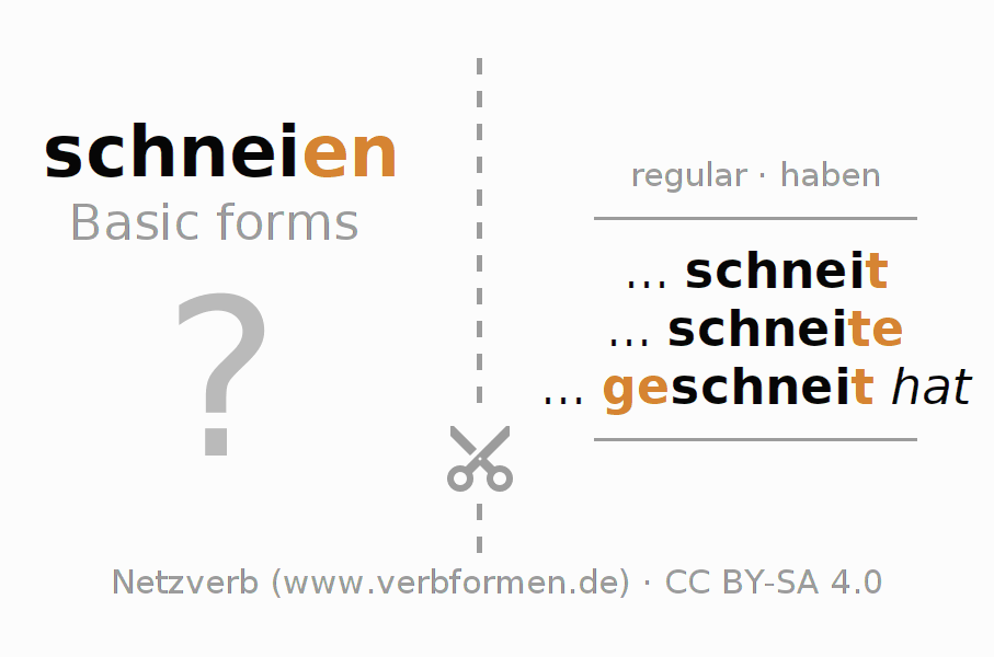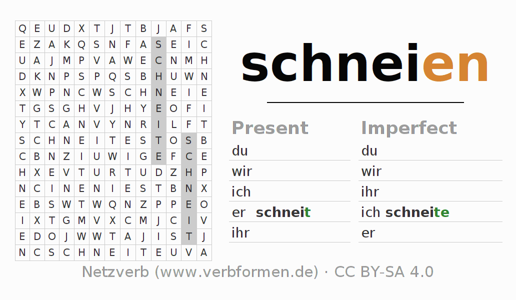 Worksheets are used generally for the conjugation of the verb schneien in teaching. The materials can be used as Open Educational Resources (OER) for exercises, for games and as Tasks (CC BY-SA 4.0). There are many different types of tasks available for the verb schneien (hat). These are overview sheets with complete conjugation, puzzles and games that require joint learning. The entire educational material is available for free as a PDF download, as pictures and as an interactive browser version. In addition to the tasks, countless examples for schneien also provide an aid to using the verb.