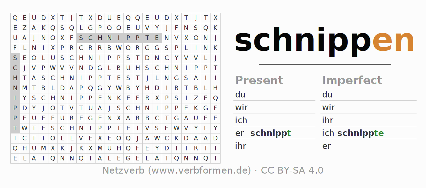 With these search word puzzles you can learn the conjugation of the German verb schnippen.